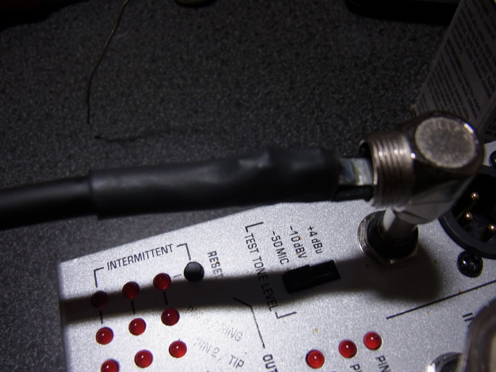 この時プラグが固定されていないと作業がしづらいので、BEHRINGER のケーブルテスターを使って作業してます。